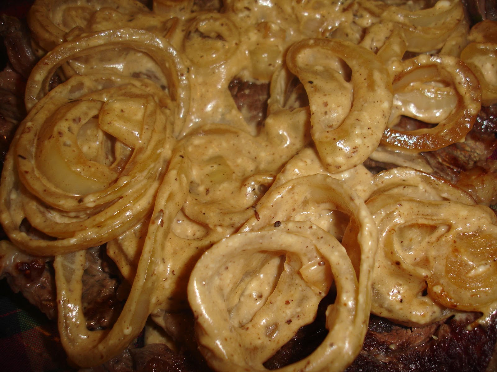 Acrescente em cima dos bifes o creme com as cebolas e está pronto