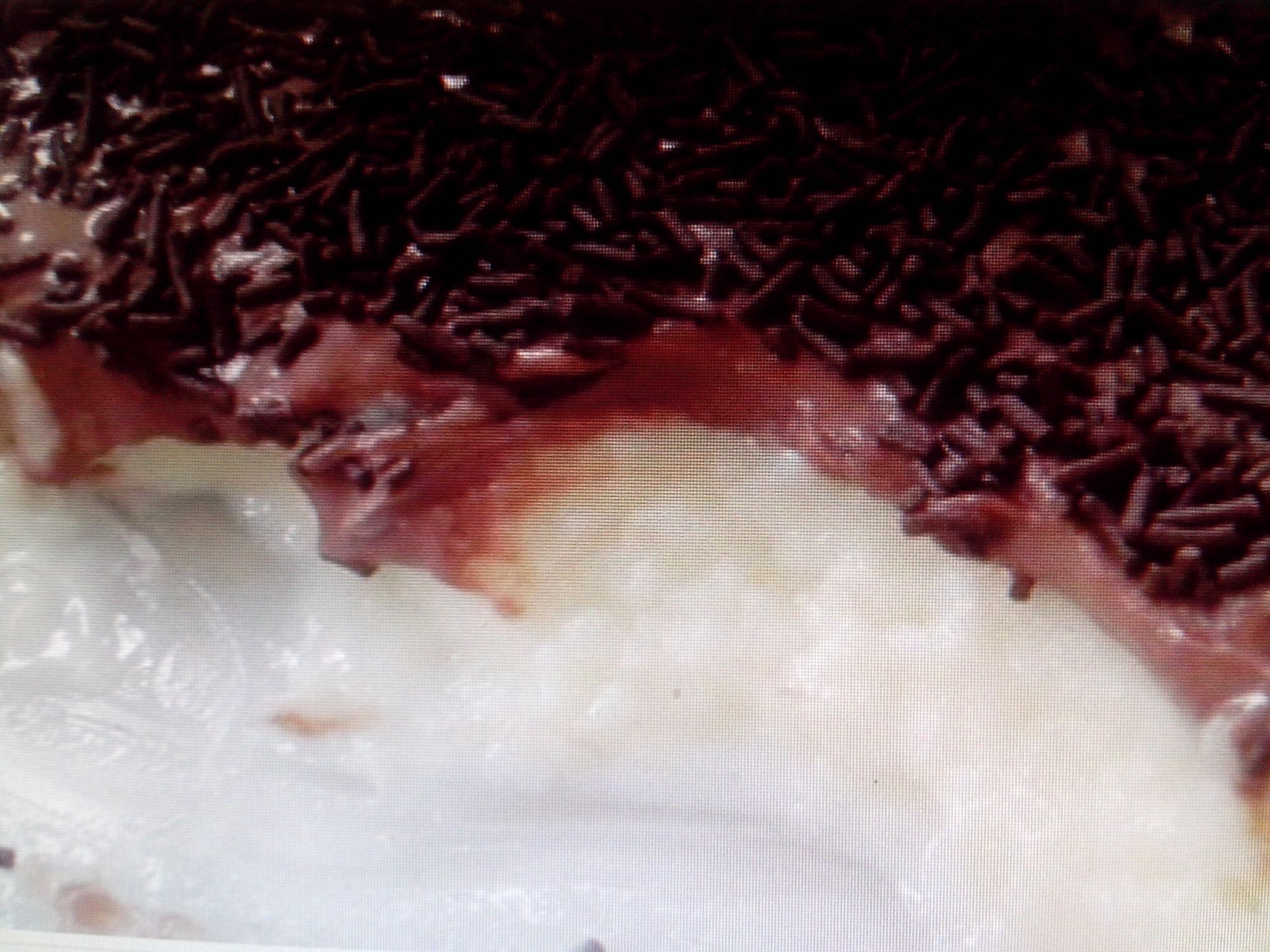 Coloque a metade do creme de coco em uma travessa, um pouco do chocolate e assim sucessivamente, cubra com chocolate granulado.Leve a geladeira.