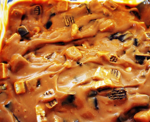 Espere as latas esfriarem antes de abri-las. Logo após, misture o doce de leite com o creme de leite e os biss cortados em cubos.