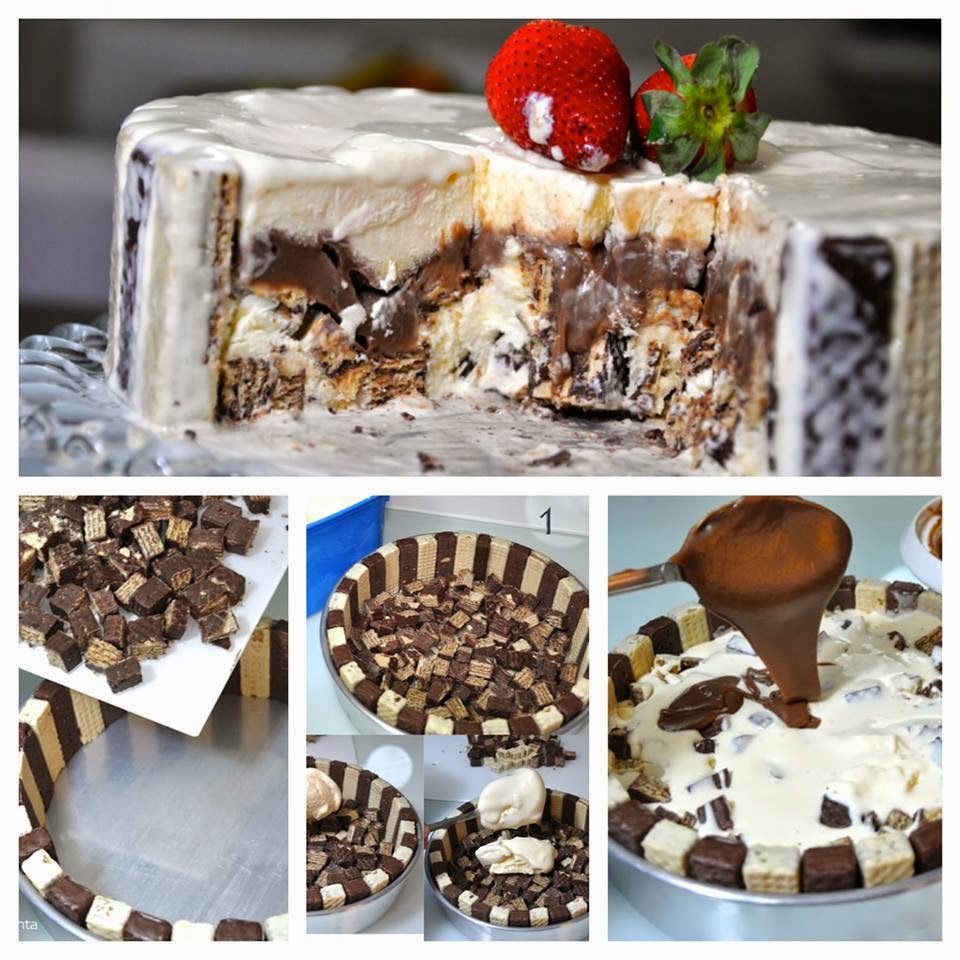 - Caso você não tenha uma forma de fundo removível, uma boa dica para desenformar, mais facilmente, é: Forre o fundo de uma forma tradicional, com plástico filme, use uma metragem maior a fim de que ele fique pra fora da forma. Monte o sorvetão e após 'congelado', retire-o com o auxílio do plástico, puxando-o para fora da forma.