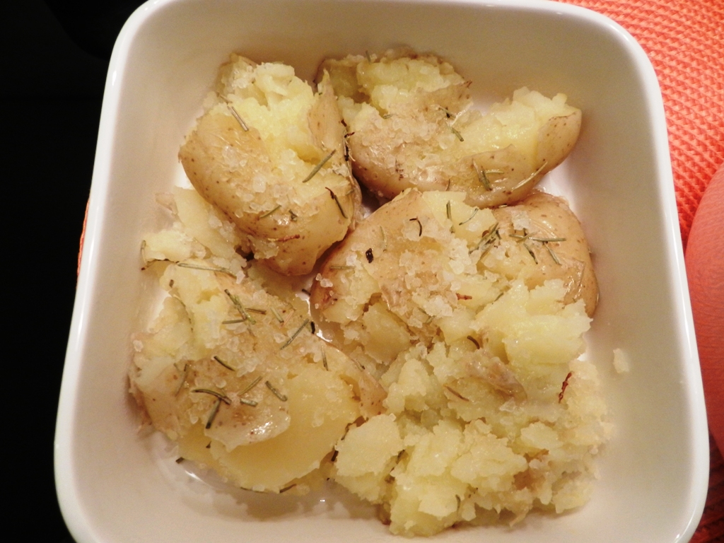 Em cima das batatas, colocar o restante do sal grosso, as colheres de azeite e o alecrim.