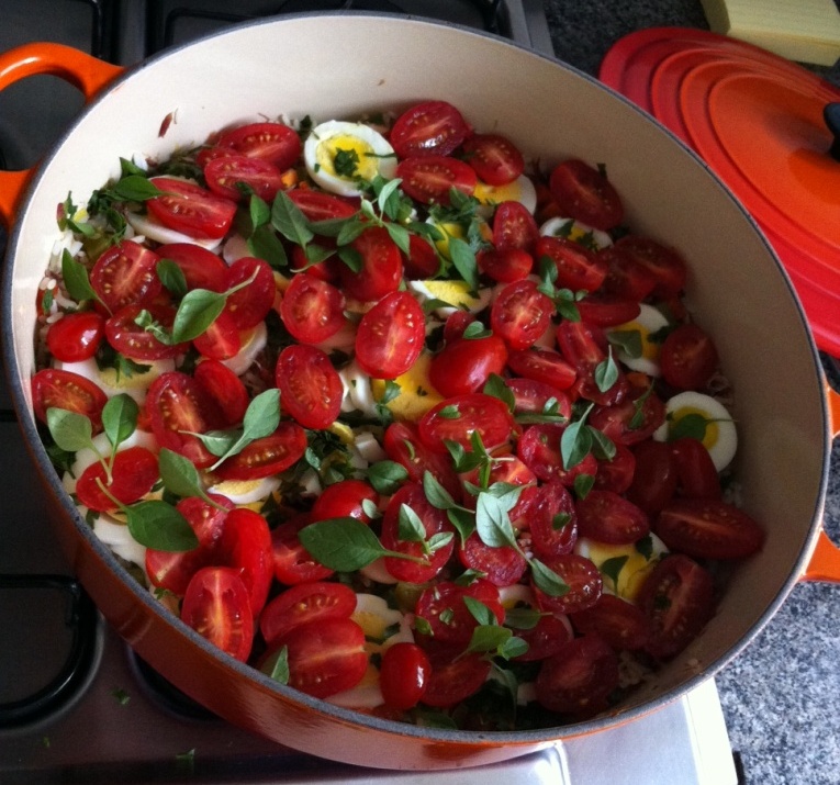 No arroz, colocar os ovos cozidos cortados em rodelas e a salsinha.