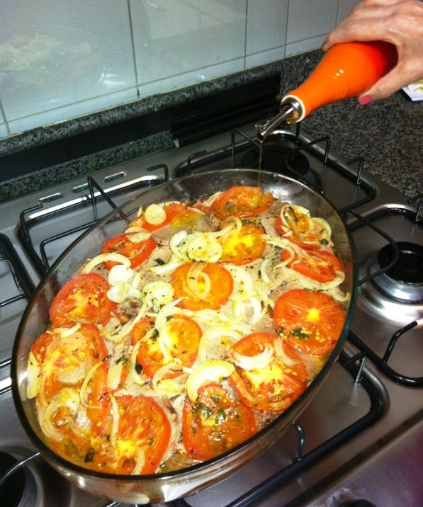 Na hora de servir, pode colocar um fio de azeite na carne.