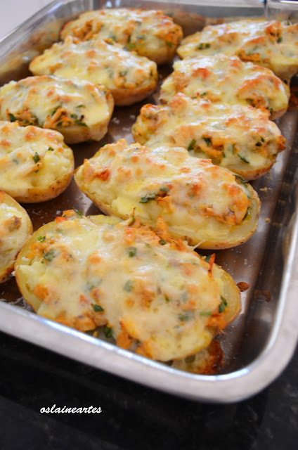 Retire as batatas do forno, deixe esfriar por 10 minutos, com cuidado corte-as ao meio e retire o miolo com uma colher deixando a cavidade da casca.