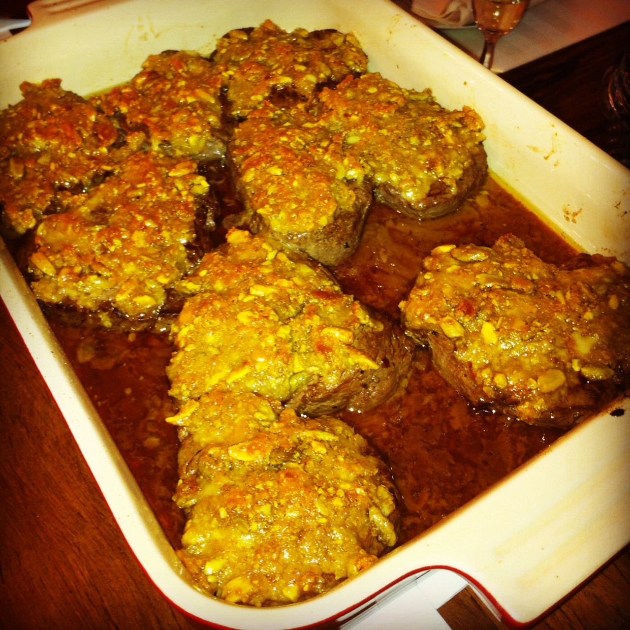 Cubra os medalhões com a crosta de pistache e leve ao forno pré-aquecido a 180 graus até que estejam dourados. Sirva imediatamente.