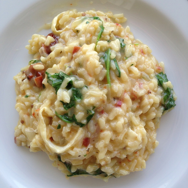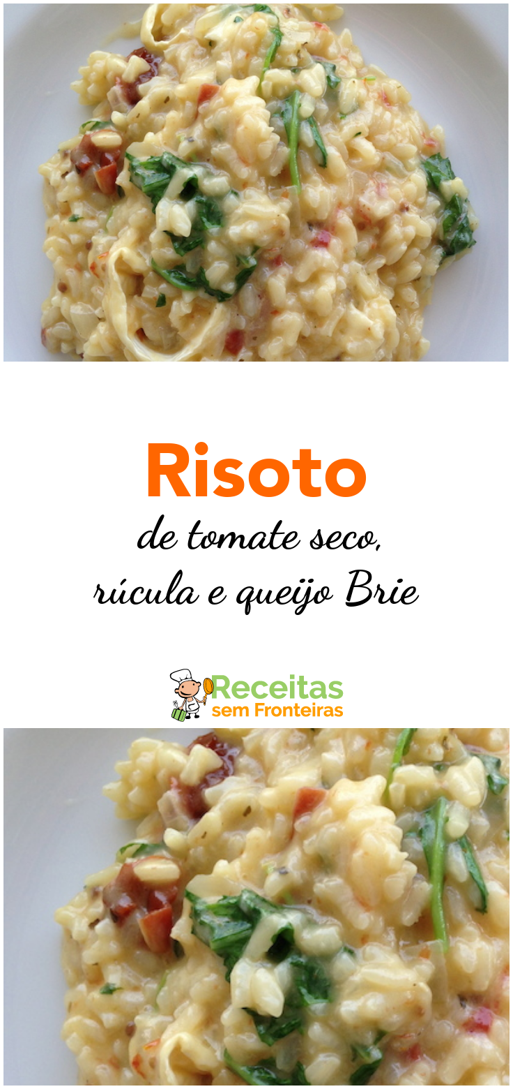 Quando estiver mole, desligue o fogo e coloque a rúcula, o queijo brie, o azeite e o queijo ralado.