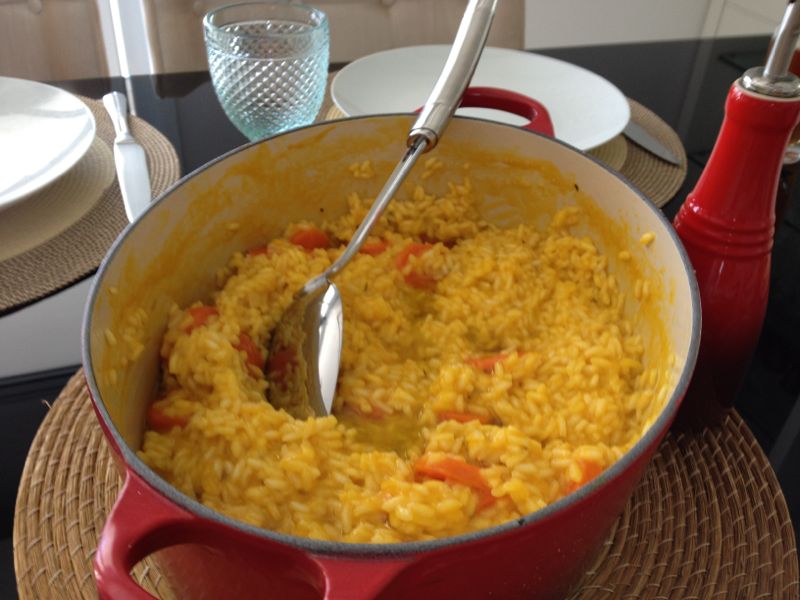 Quando acabar o caldo, desligue o fogo e adicione a cenouras caramelizadas, suco e raspas da laranja, parmesão ralado e a manteiga restante.