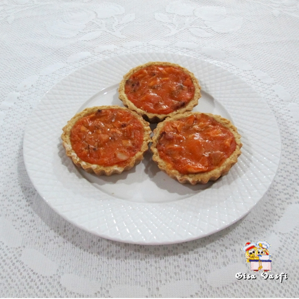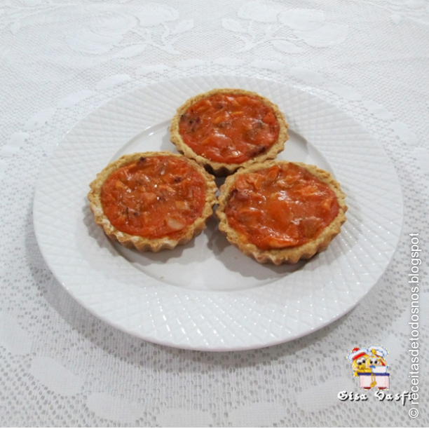 Forre forminhas de torta com a massa, preencha com o recheio, polvilhe queijo ralado e leve para gratinar.