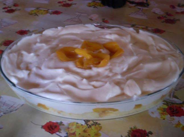 Num refratário, coloque os pêssegos escorridos, cubra com o creme reservado e espalhe o suspiro reservado.