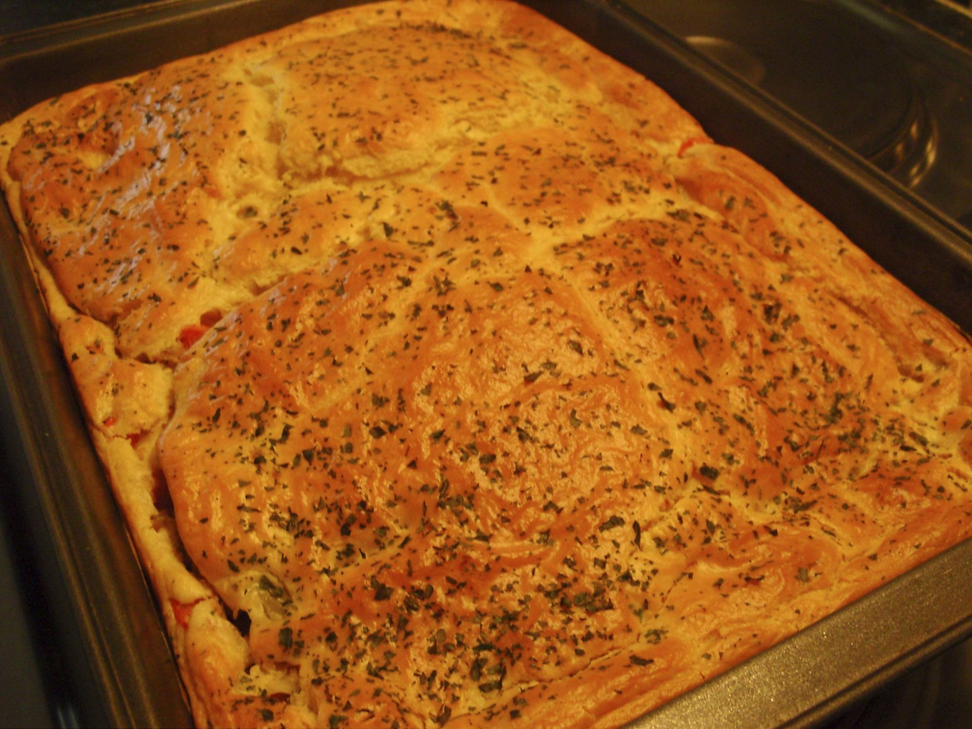 Coloca-se na forma untada a metade da massa, o refogado de legumes e cobre com o restante da massa
