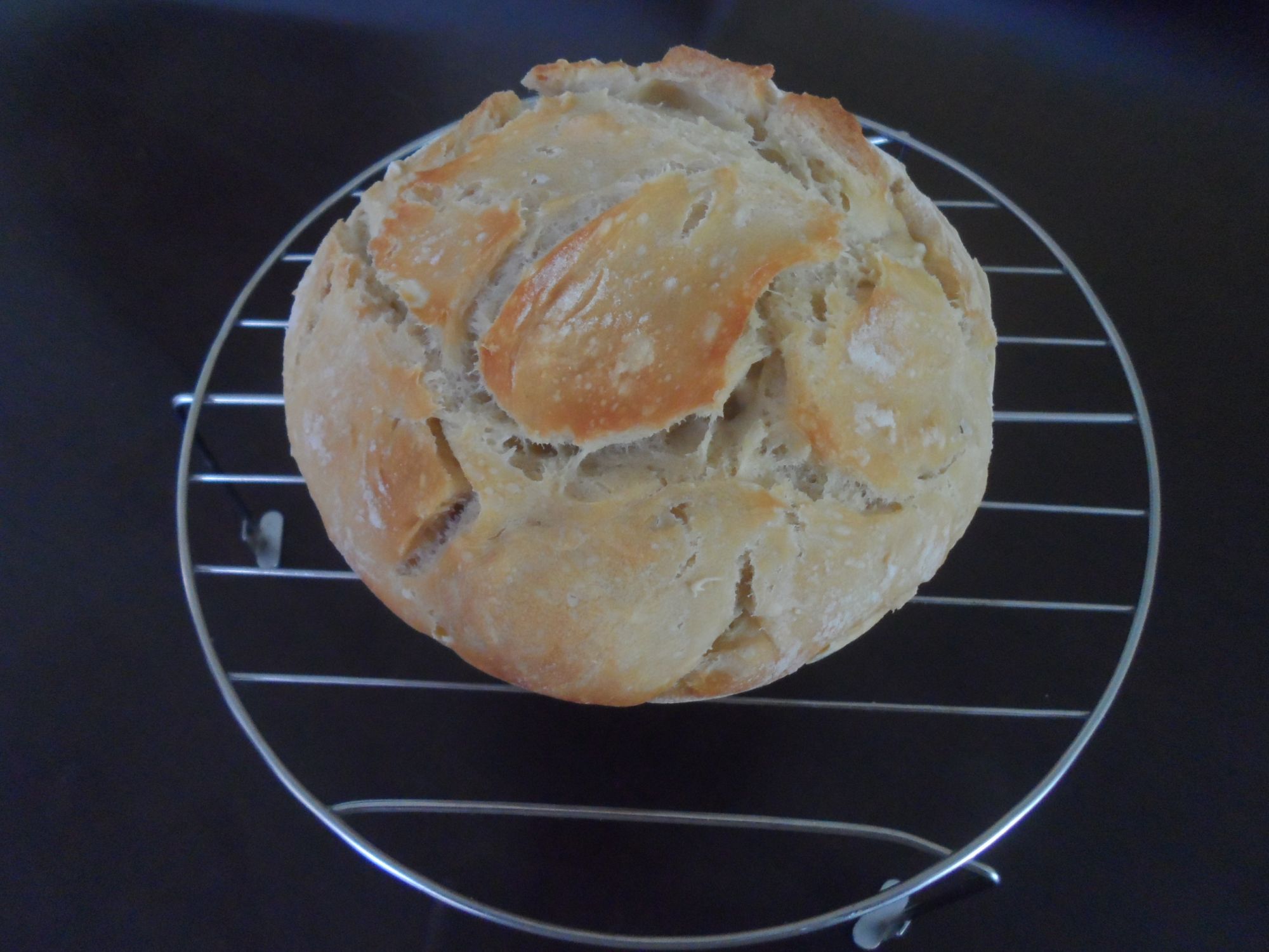 Comece misturando os ingredientes secos e, em seguida, adicione a água. Misture bem até obter uma massa mole: não precisa colocar mais farinha (talvez mais um tiquinho de água, se a massa ficar muito seca). Coloque a massa num recipiente grande e cubra com filme plástico. Deixe descansar por 12 a 18 horas. Após esse descanso, transfira a massa para um pano coberto com bastante farinha. Forme uma bola e cubra com o mesmo filme plástico. Enquanto isso, aqueça o forno a 230°C e coloque uma panela com tampa por aproximadamente 30 minutos. Após esse período, coloque a bola de massa dentro da panela quente, tampe e leve ao forno por mais 30 minutos. Depois dessa meia hora assando, retire a tampa da panela e deixe assar por mais 15 minutos ou até que a crosta fique dourada.Após transfira-o para uma grade, para deixá-lo esfriar.