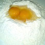 Vá misturando aos poucos a farinha com os ovos até formar um massa homogênea, amasse ela por certa de 10min. e depois enrole com papel filme e deixe descaçar por aproximadamente 1 hora.