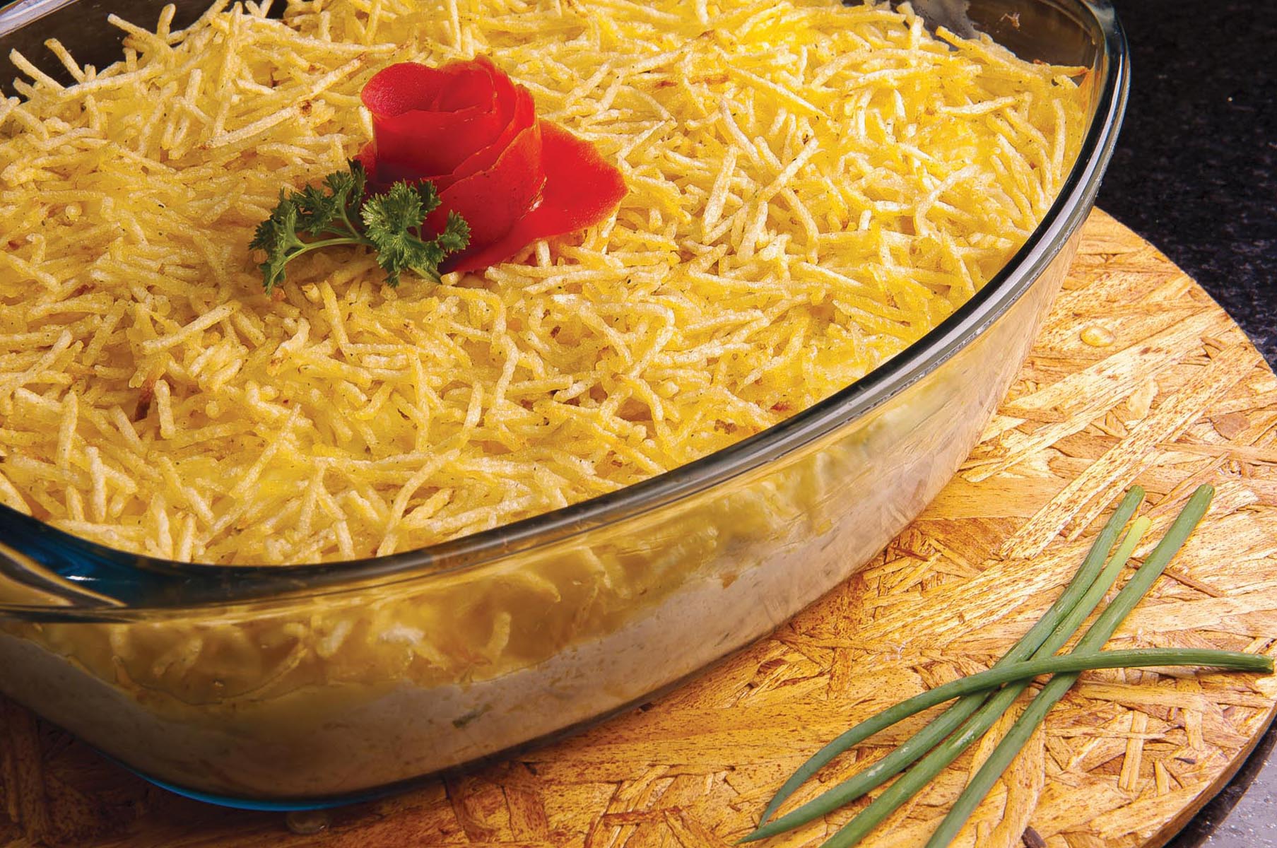 Coloque o refogado numa assadeira, cubra com mussarela e espalhe a batata palha por cima