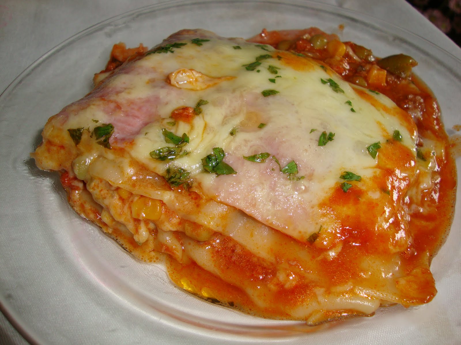 Intercalar em um refratário os molhos com a massa de lasanha, presunto e mussarela