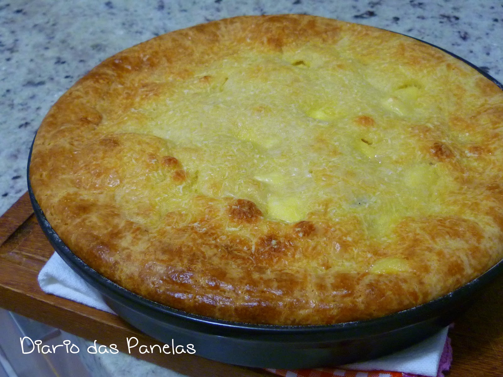 Em uma forma untada, despeje um pouco da massa para cobrir o fundo, depois acrescente todo recheio e cubra com o restante da massa.
