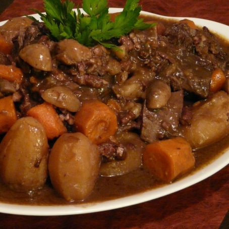 Frite a carne aos poucos na mistura de azeite ou óleo e manteiga bem quente, deixando dourar de todos o lados. Espalhe a farinha por cima da carne e mexa bem. Junte o vinho tinto, os champignons, os tabletes de Caldo MAGGI® de Carne, duas xícaras (chá) de água fervente e o louro. Tampe a panela e deixe cozinhar, em fogo baixo, por aproximadamente 2 horas ou até que a carne fique macia e o molho na consistência desejada, mexendo de vez em quando. Sirva com purê de batatas.