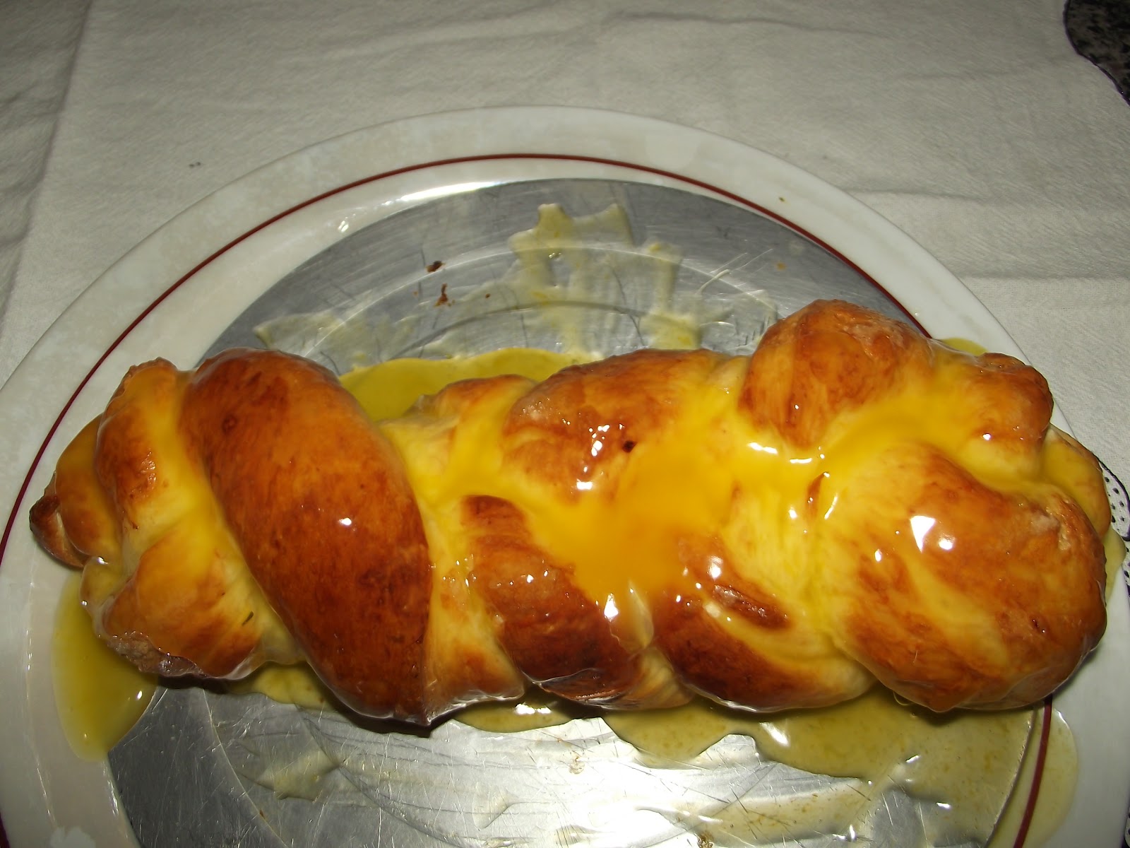 Pão em formato de trança, com laranja cristalizada e coberto com calda de suco de laranja e açúcar.