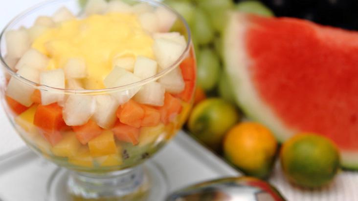 Salada de frutas com molho de Iogurte Natural, mel e raspas de limão.