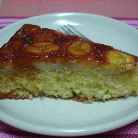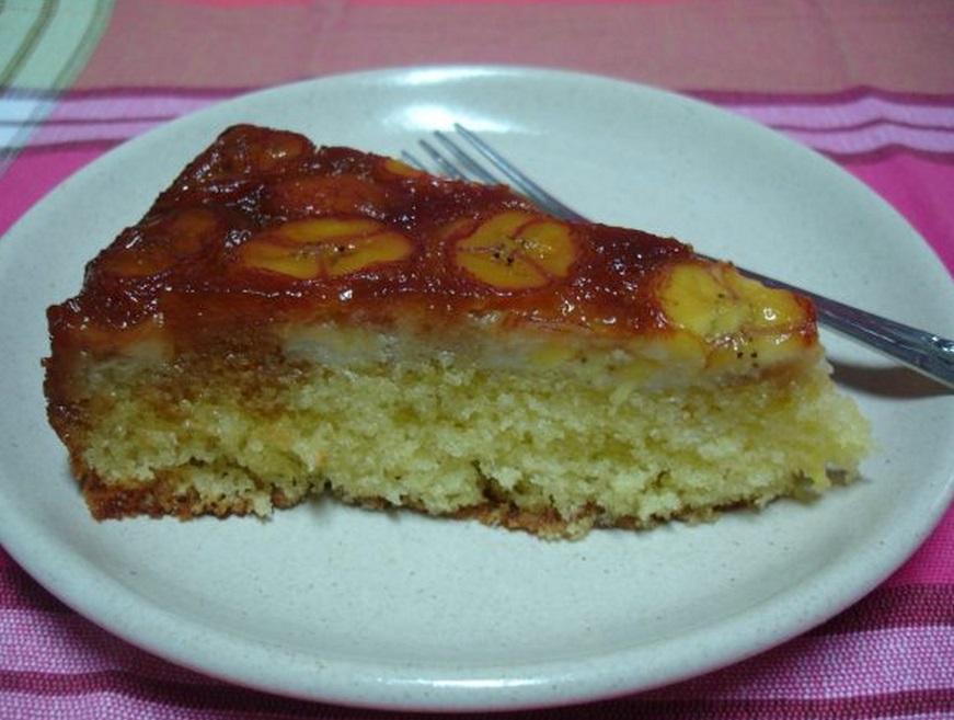 Logo após, fatiar as bananas e colocá-las sobre o açúcar caramelizado e despejar a massa em cima.