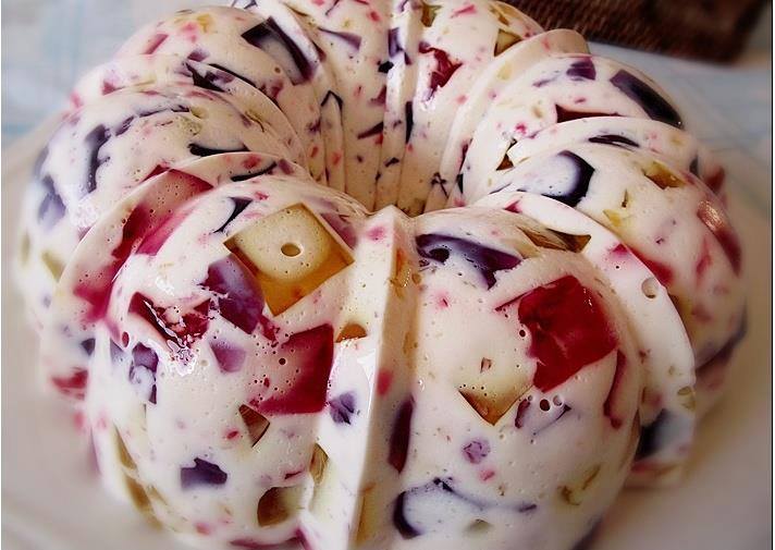 Depois de bem firme corte as gelatinas em cubinhos e as disponha de maneira espalhada em uma forma de cone central.