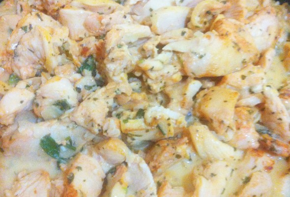 Quando tudo estiver bem douradinho e soltando aquele caldinho natural, deixe o fogo brando e junte o requeijão e as ervas picadinhas e deixe cozinhas por mais 3 minutos.