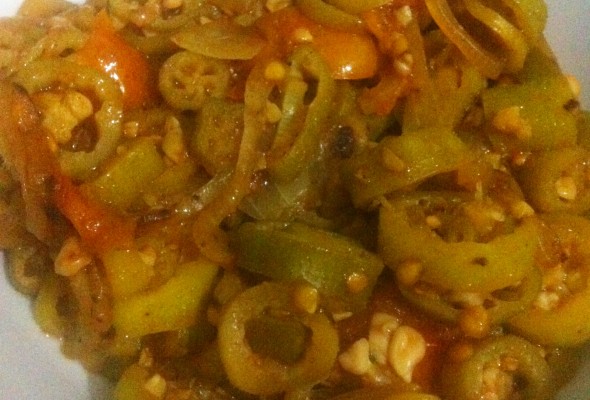 Acrescente o quiabo picado e mexa rapidamente e espere 1 minuto.