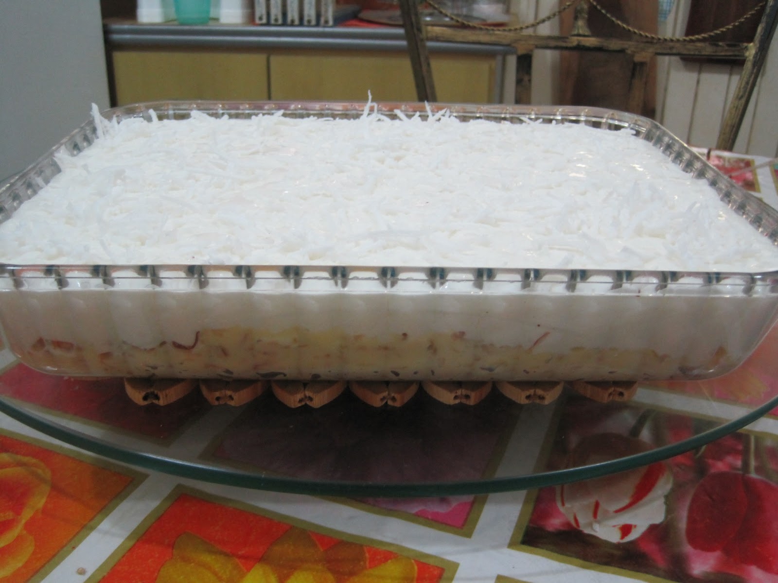 Umedeça os biscoitos na calda da ameixa. Numa forma de bolo ingles, de 11 cm x 25 cm, alterne camadas de biscoito, doce de coco e ameixa picada.