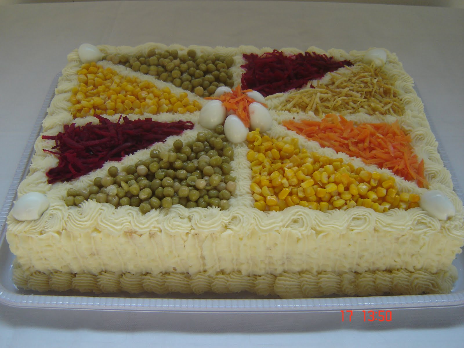 Decore com ovos de codorna, batata palha, cenoura e beterraba cruas e raladas, milho, ervilha e azeitonas.