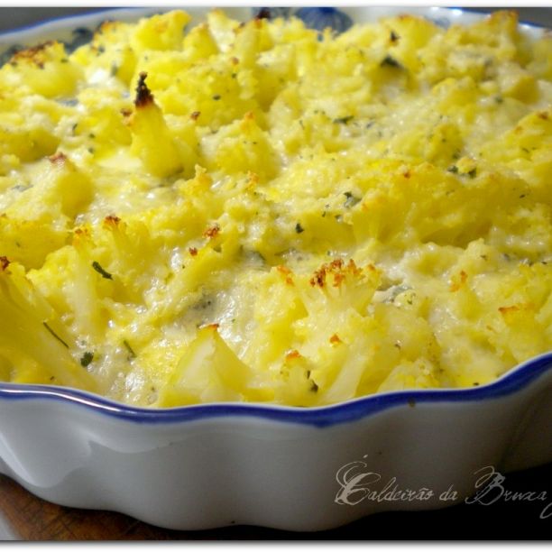 Cozinhe a couve flor em água e sal a gosto e algumas gotas de vinagre. Escorra e amasse com um garfo, sem reduzi-la completamente a um pure, e reserve.