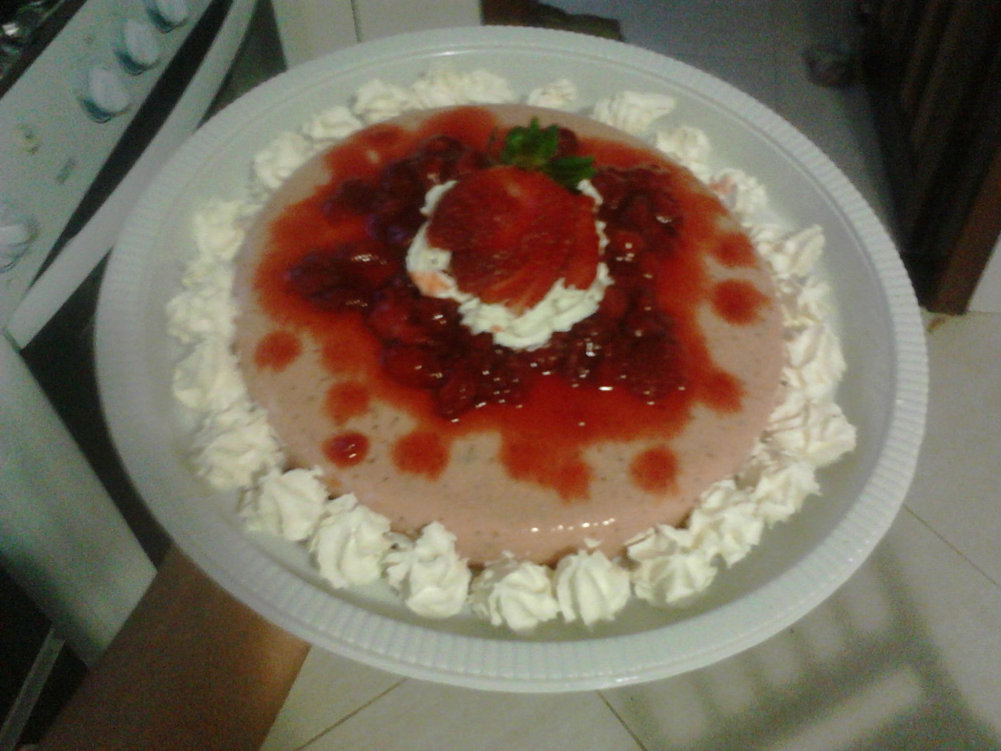 Coloque o creme de leite em uma batedeira e bata até obter o ponto de creme chantilly, e acresecnte delicadamente ao creme de morangos. Coloque em uma forma umedecida e leve a geladeira por 4 horas no minimo. Retire cuidadosamente da forma. sirva decorando com morangos inteiros.