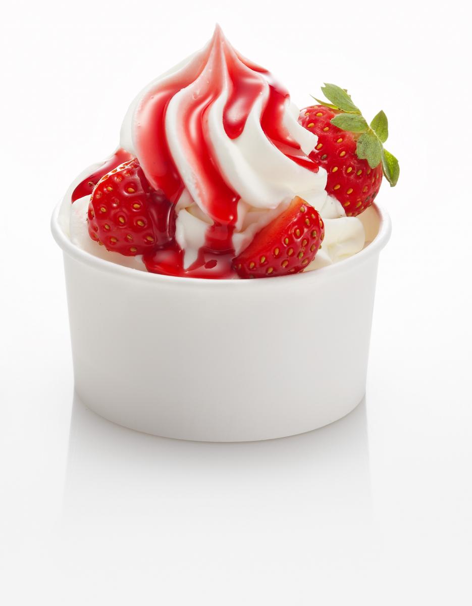 Coloque em cada taça duas bolas de Frozen Iogurte, espalhe sobre elas duas colheres (sopa) de cobertura de morango. Sirva a seguir.
