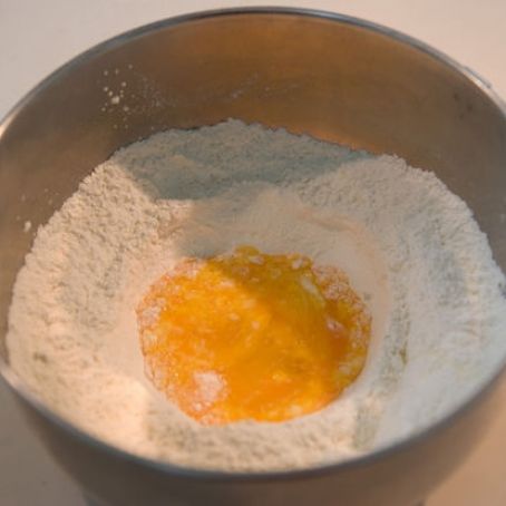 Junte todos os ingredientes secos numa tigela, e depois faça um buraco no centro. Numa outra vasilha, junte a água e o ovo (de preferência tire a pele da gema) e bata. Coloque essa mistura no buraco feito e lentamente misture os ingredientes.