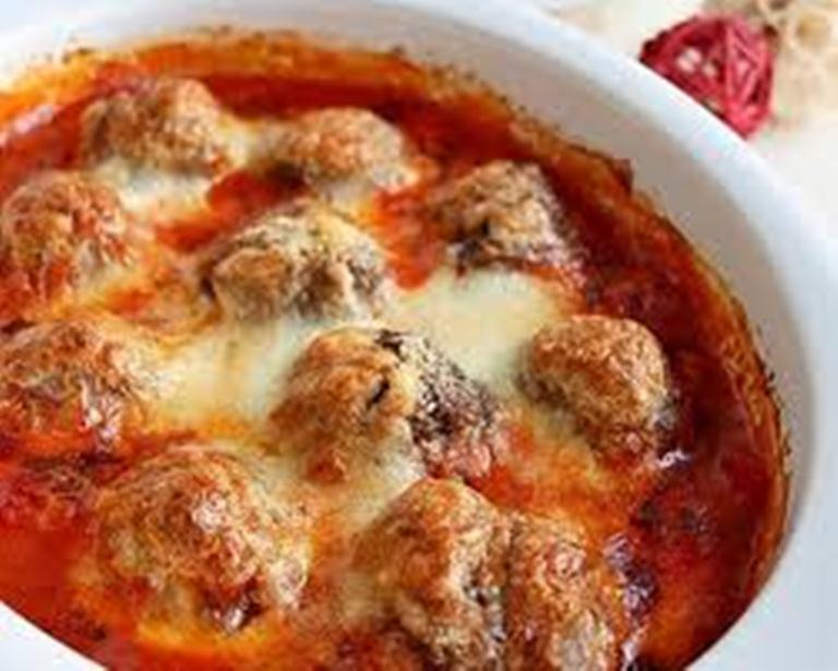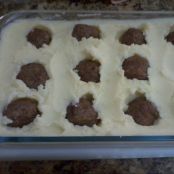 Passe o purê para um refratário e faça pequenas cavidades,preenchendo-as com almondegas congeladas. Cubra com uma camada de molho de tomate e queijo ralado. Leve ao forno pré aquecido e asse por 30 minutos.