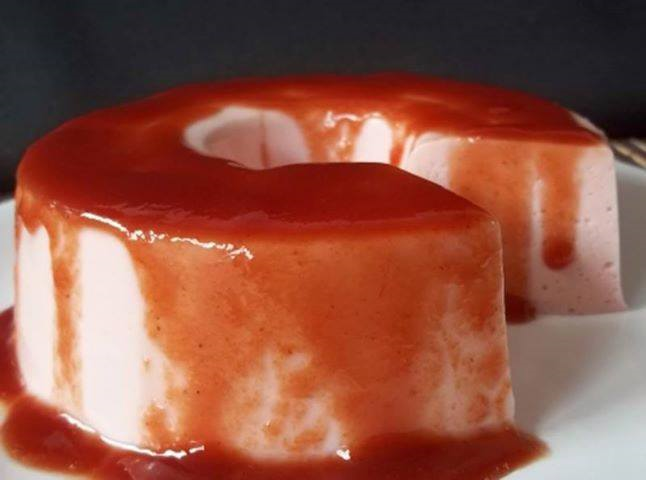 Bater no liquidificador: o leite condensado, o creme de leite, o suco de goiaba e a gelatina hidratada e dissolvida.