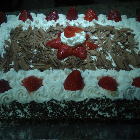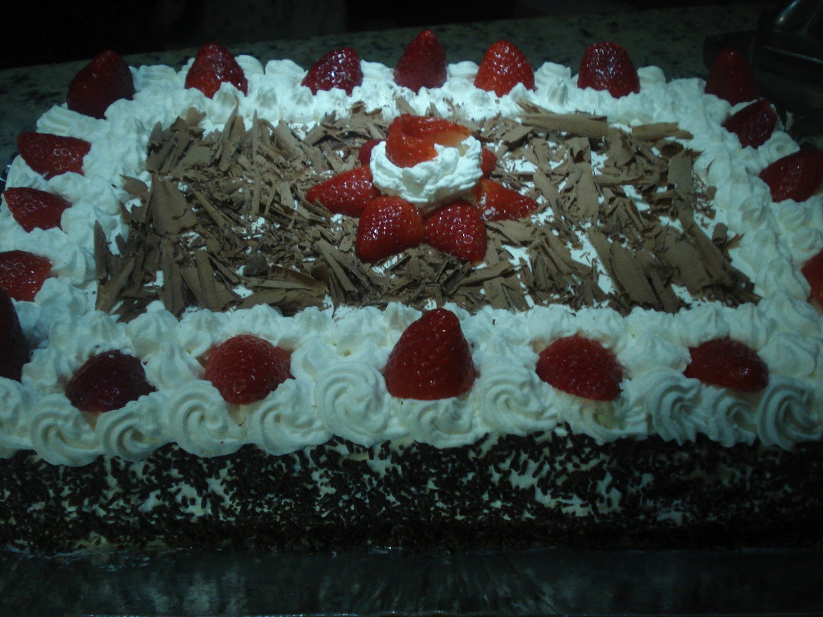Recheie o bolo e cubra somente a parte de cima. Decore com morangos.