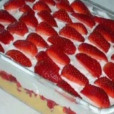 Uma camada de biscoitos bem úmidos, metade dos morangos picados, o creme de manteiga, outra camada de biscoitos, o restante dos morangos picados e por último, o chantili.
