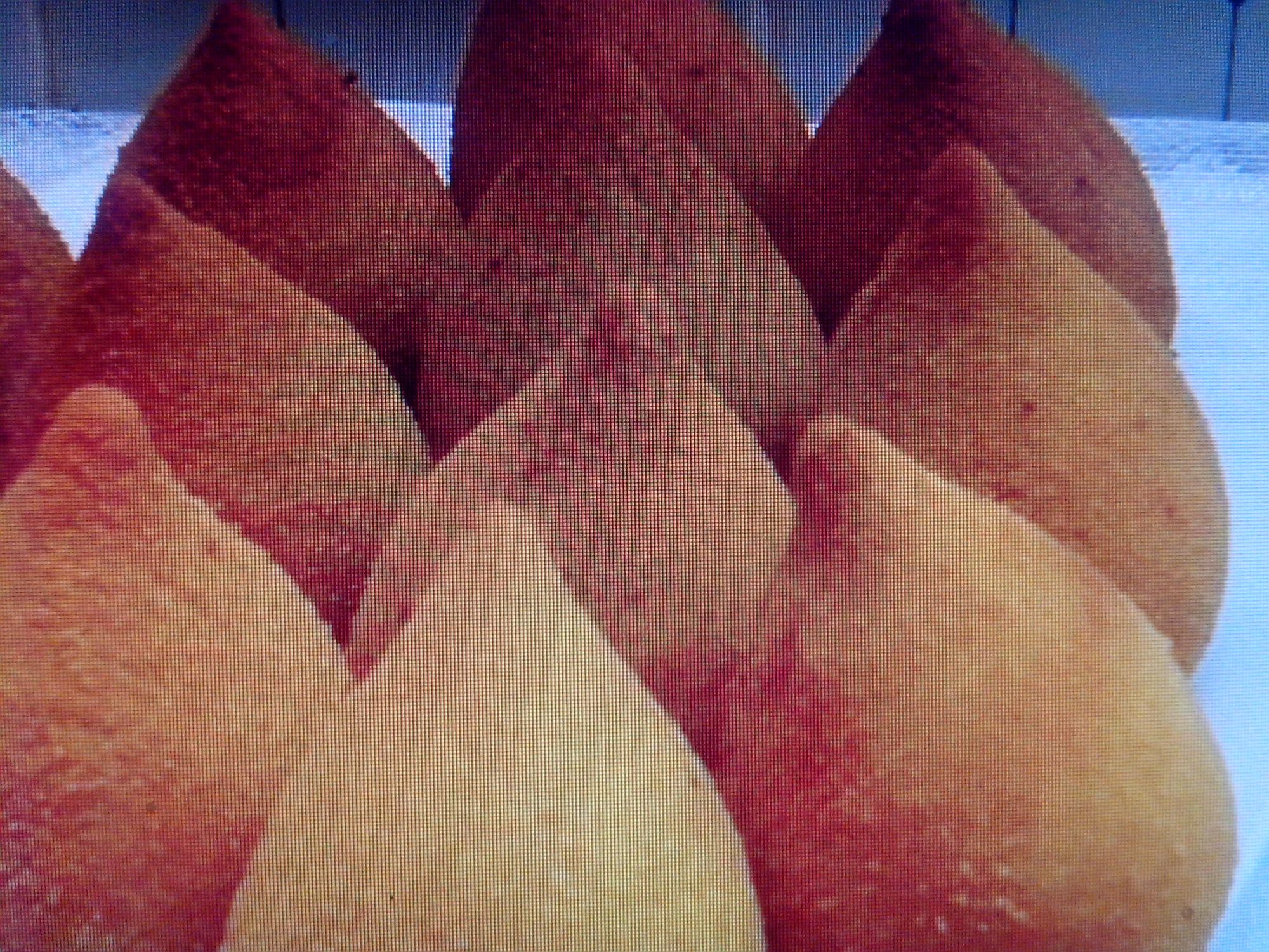 Depois de alcançar uma textura lisa, descascar as batatas e com um amassador ou uma peneira espremer em cima da massa aberta, aos poucos, pois a batata é só para deixar a massa mais macia e gostosa, ela não pode ficar mole demais nem grudando nas mãos, senao vai dificultar na hora de fechar as coxinhas