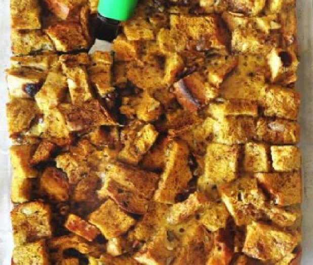 No liquidificador bata o leite, os ovos, o açúcar e a essência. Coloque essa mistura em cima dos pães, apertando bem com o auxílio de uma colher, até que estejam bem molhados.