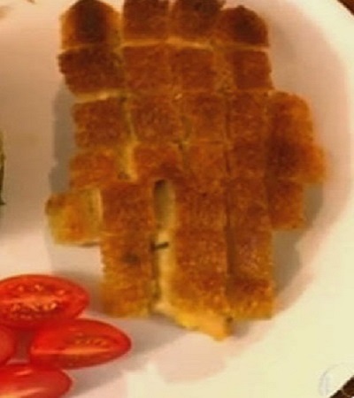 Passe o frango somente de um lado na farinha de trigo, no ovo e nos cubos de pão. Pressione bem com as mãos.