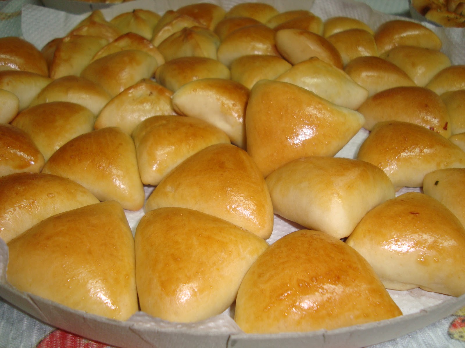 Feche a de forma triangular e coloque numa assadeira untada e enfarinhada, com a parte fechada para baixo