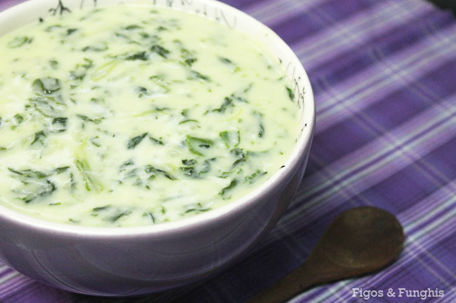 Cozinhe por 6 minutos até formar um creme e coloque o espinafre, o creme de leite e o sal