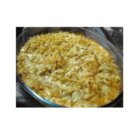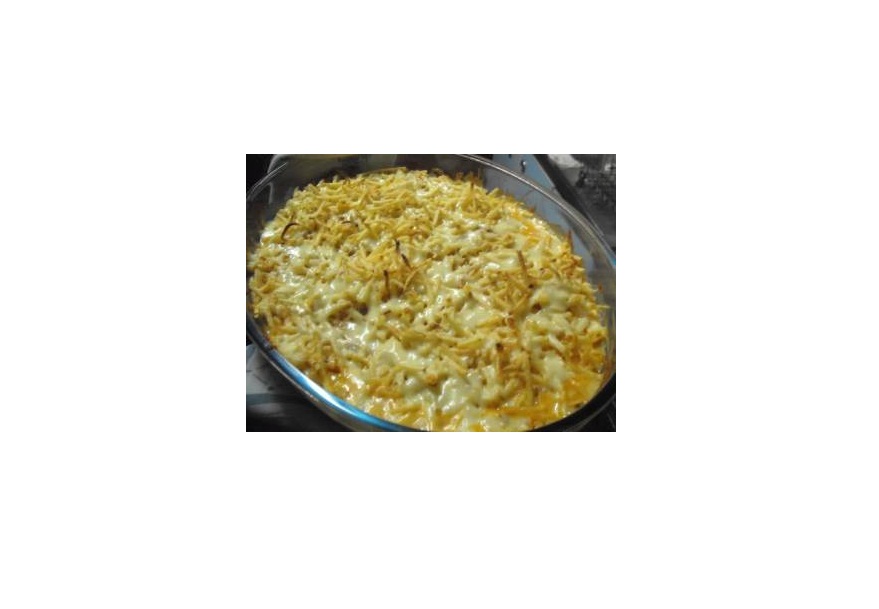 Tire do forno, acrescente a batata palha e o queijo picado e deixe por mais 5 minutos no forno.