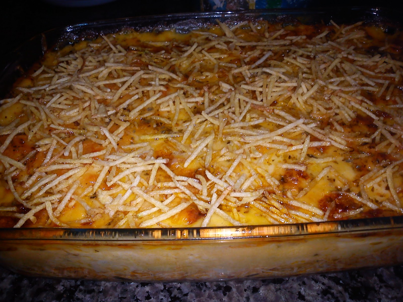 Cubra com queijo ralado e leve ao forno alto por cerca de 30 minutos ou até dourar. Sirva com batata palha