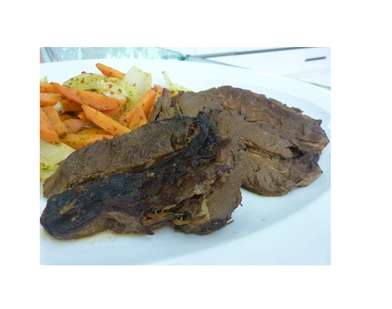 4 – Na hora de servir, leve o refratário ao fogo para esquentar a carne. Retire a carne do refratário, adicione ao caldo 3 colheres (sopa) de amido de amilho dissolvido em 1 xícara (chá) de água e misture até engrossar o molho. Sirva em seguida com legumes cozidos.