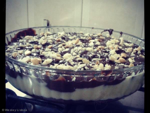 Salpique a castanha de caju e para cobertura derreta 400 gramas de chocolate ao leite e coloque por cima, espalhando devagar pra cobrir todo o pirex
