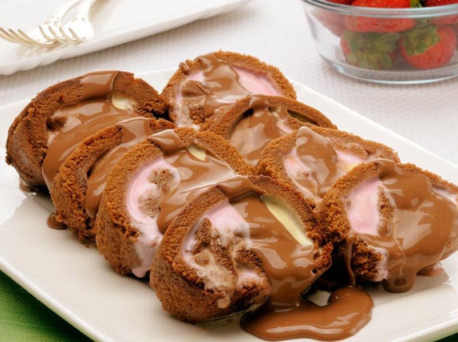 Retire o rocambole do freezer, desembrulhe e coloque-o em uma travessa. Cubra com o creme reservado e sirva em seguida.