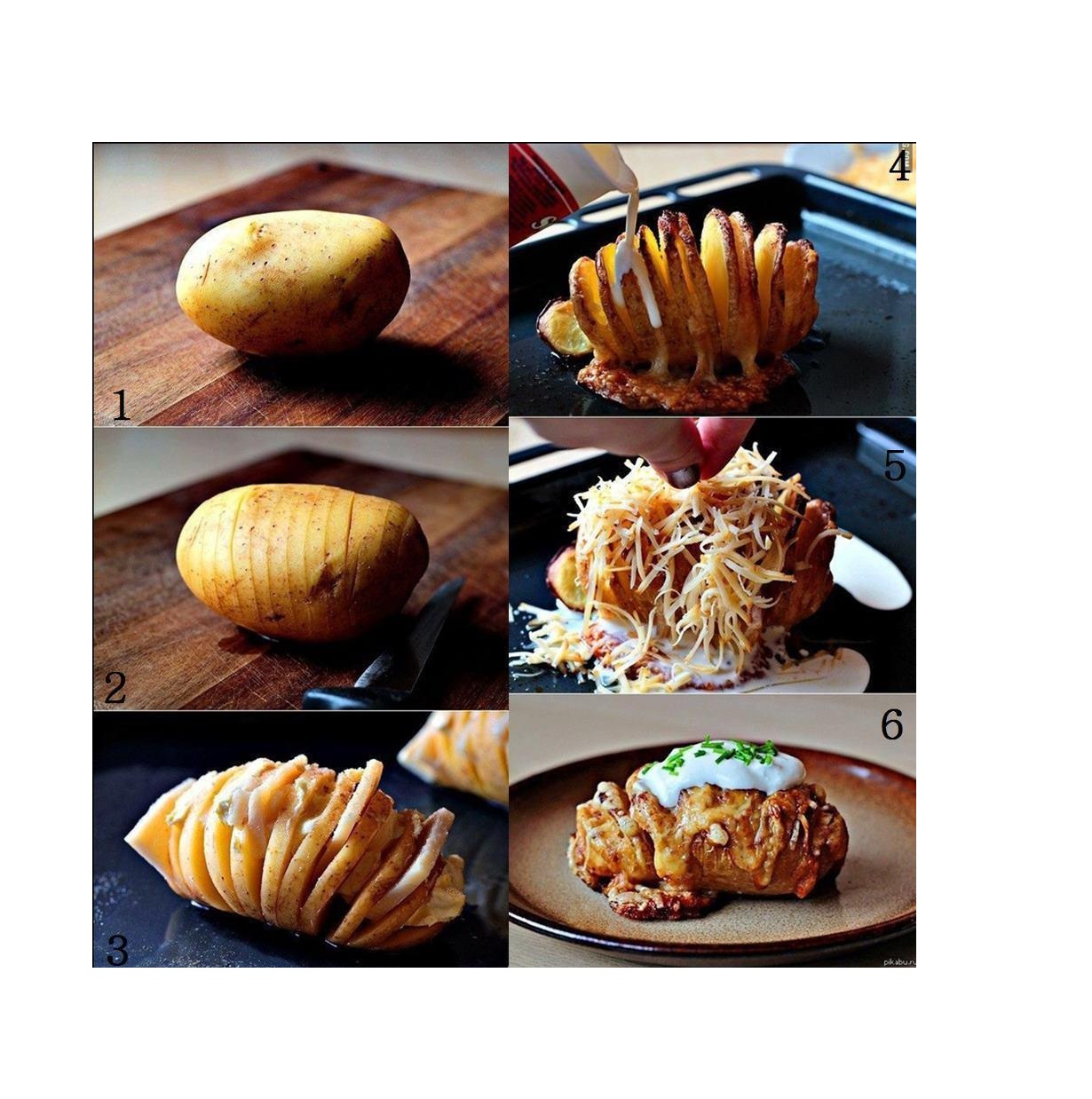 Com uma faca afiada, fatie a batata em intervalos de 3 a 6 mm. Tome cuidado para não cortar as fatias até o final, para não desmanchar a batata, as fatias devem ficar presas pela parte inferior.