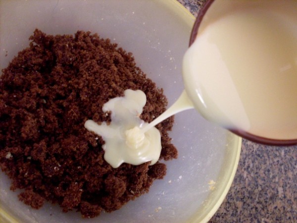 : Com o bolo bem esfarelado, junte o leite condensado aos poucos, quando eu digo: aos poucos, é em fio mesmo!