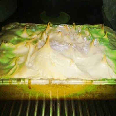 Leve ao forno pré-aquecido para dourar, quando o creme estiver dourado, aproximadamente 20 minutos, acrescente o chantilly sobre o creme e leve ao forno novamente para dourar o chantilly, cerca de 10 minutos.