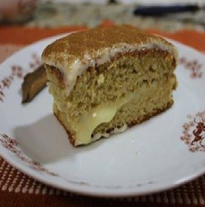 Depois de assado partir o bolo de duas partes, rechear com metade do creme, colocar a outra parte do bolo, cobrir com o restante do creme e decorar com pedaços de canela em pau e canela em pó.